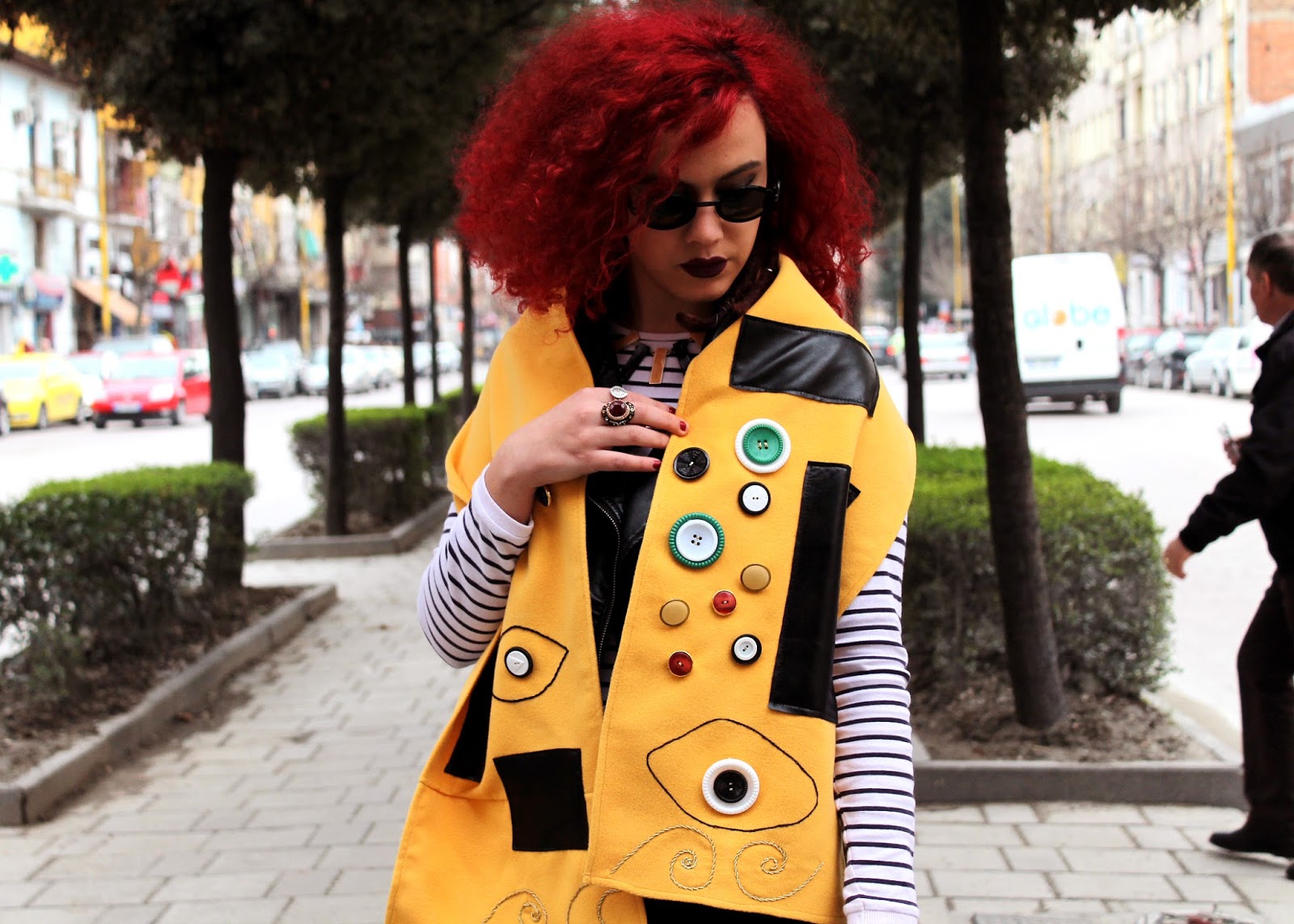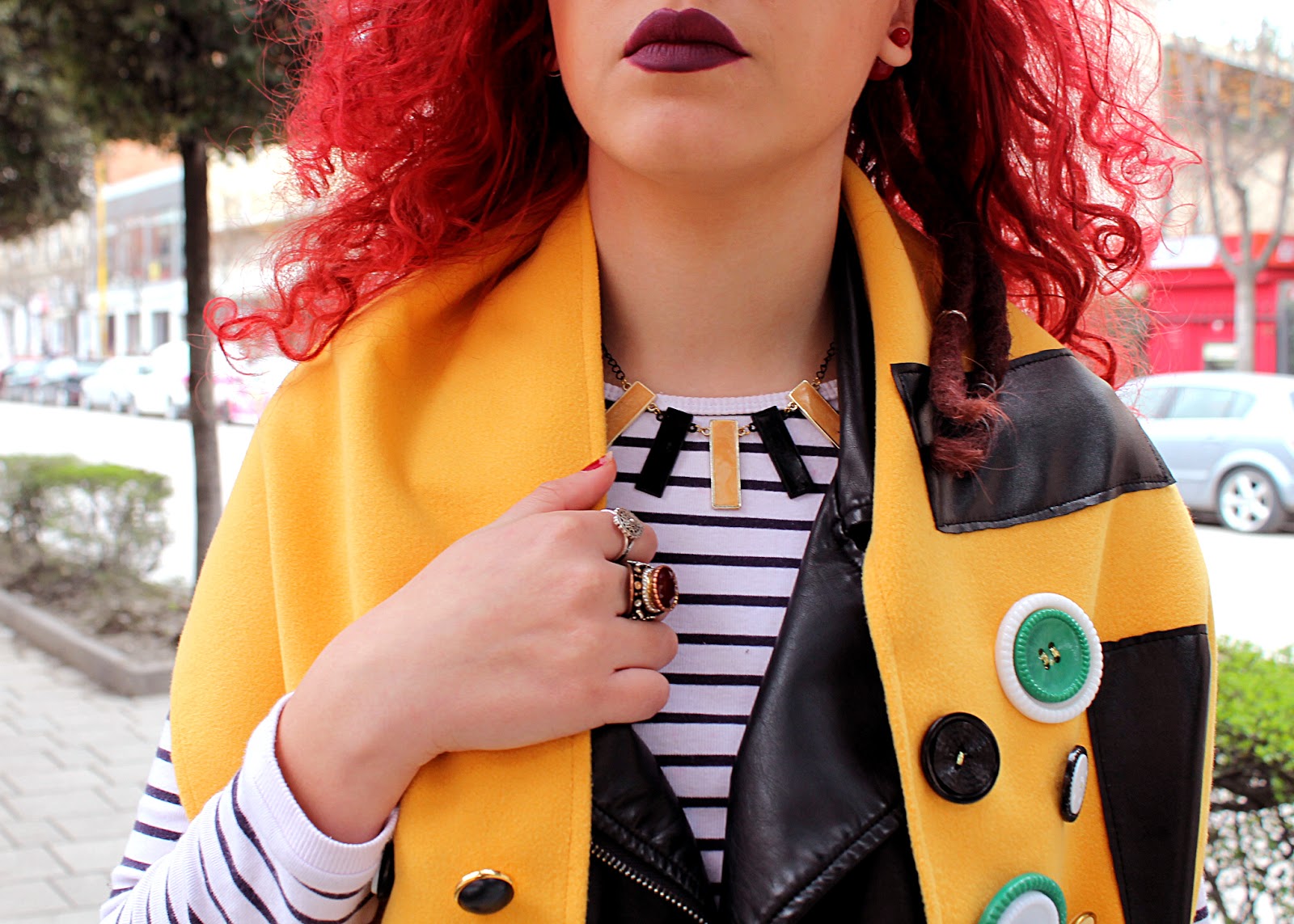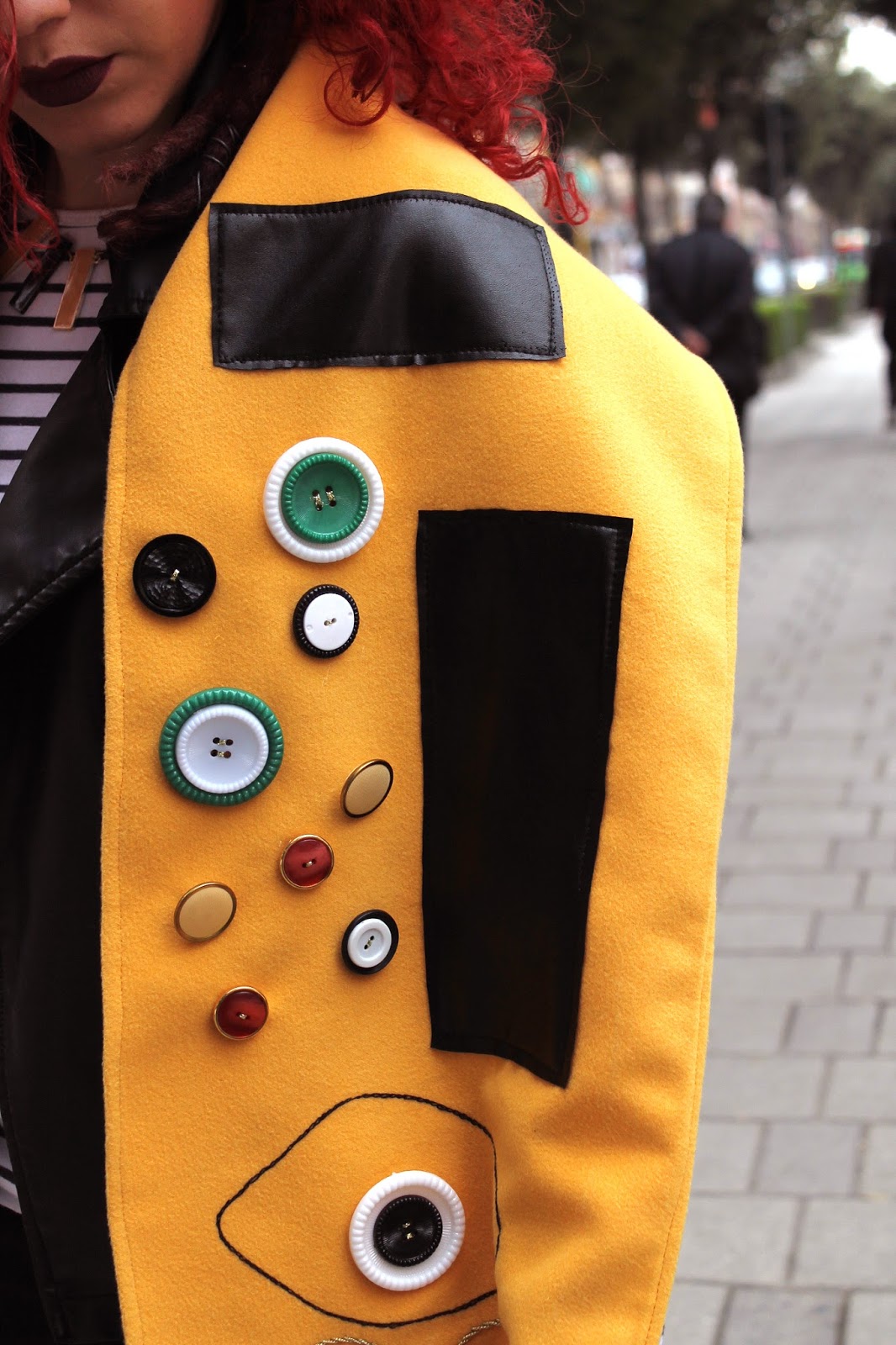I used a yellow synthetic fabric for the scarf, black leather for the rectangle shapes, colorful buttons for the circles especially in black, white and green color and of course the golden strings couldn’t be missed.
